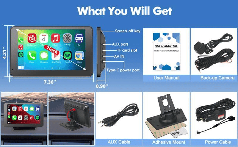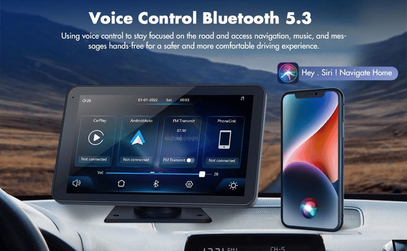 【Wireless CarPlay Voice Control Portable Screen Player】The 7-inch portable Bluetooth car stereo features a capacitive touch screen with a resolution of 1024×600, providing a clear and enjoyable visual experience. Compatible with wireless CarPlay and wireless Android Auto voice control functions, it allows you to access phone calls, navigation, videos, or music after connecting to your phone via Bluetooth/WiFi.
