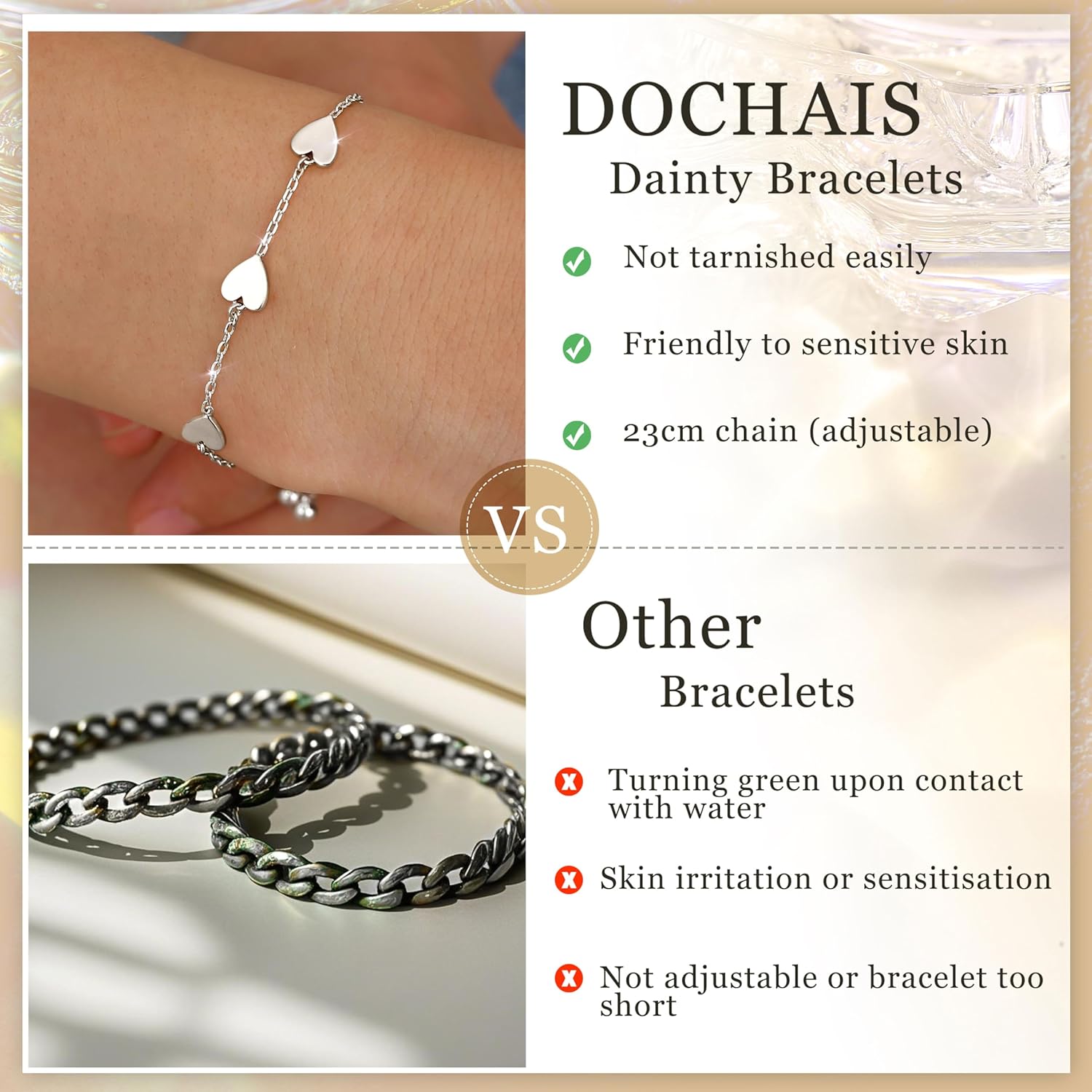 Dochais Heart Bracelet for Women - 14K Gold and Silver Bracelet, Friendship Bracelet Celebrate love and friendship with our exclusive heart bracelet set! This beautiful jewelry is not only a symbol of your affection, but also a perfect gift for every woman or girl in your life. Product Features Heart Bracelet Set Our set includes one or two elegant bracelets with a length of 23 cm and a heart size of 7 x 8 mm. The bracelets can be adjusted to fit any wrist perfectly. Hypoallergenic Material Our bracelets are made of high quality copper and plated with 14K yellow gold, with 5A+ cubic zirconia. They are hypoallergenic and nickel free, which means they do not cause allergic reactions or skin irritations. Stackable Design This stylish bracelet can be worn alone or combined with other bracelets to highlight your personal style. Gift Box Included Each heart bracelet is presented in a delicate gift box, making it the perfect gift for Valentine's Day, birthdays, holidays or as a thank you. These adjustable bracelets are ideal for women, girls and mothers, whether it is a birthday, special occasion or best friend. Details Material: High Quality Copper, 14K Yellow Gold, 5A+ Cubic Zirconia Heart Size: 7*8mm Bracelet Length: 23cm (Adjustable) Gift Box: Included Color: Gold/Silver Why this Bracelet? Our heart bracelet set is not only a piece of jewellery, but also a symbol of your love and affection. With its elegant design and hypoallergenic materials, it is the perfect gift for every woman or girl in your life.